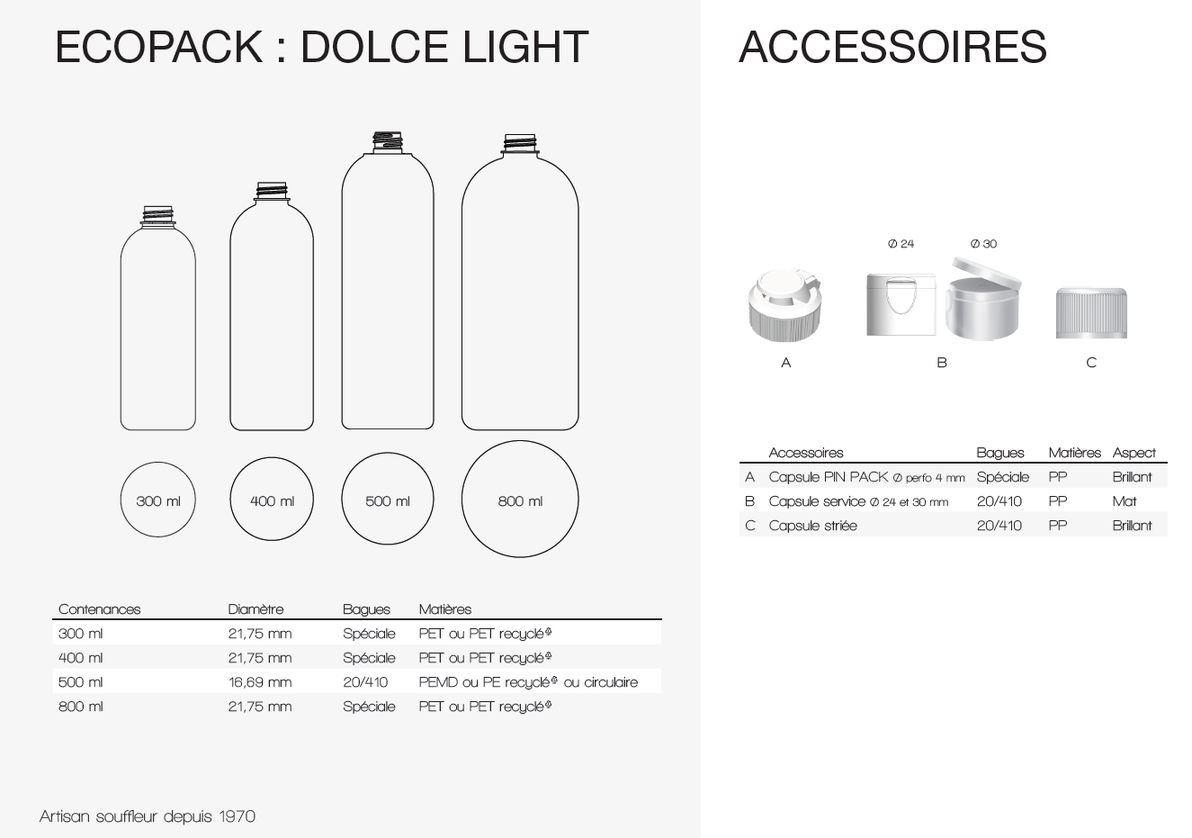 With our Eco Pack range, our new ultra-light Dolce Light bottles, we offer an innovative and sustainable packaging solution, perfectly aligned with the 3R principles: